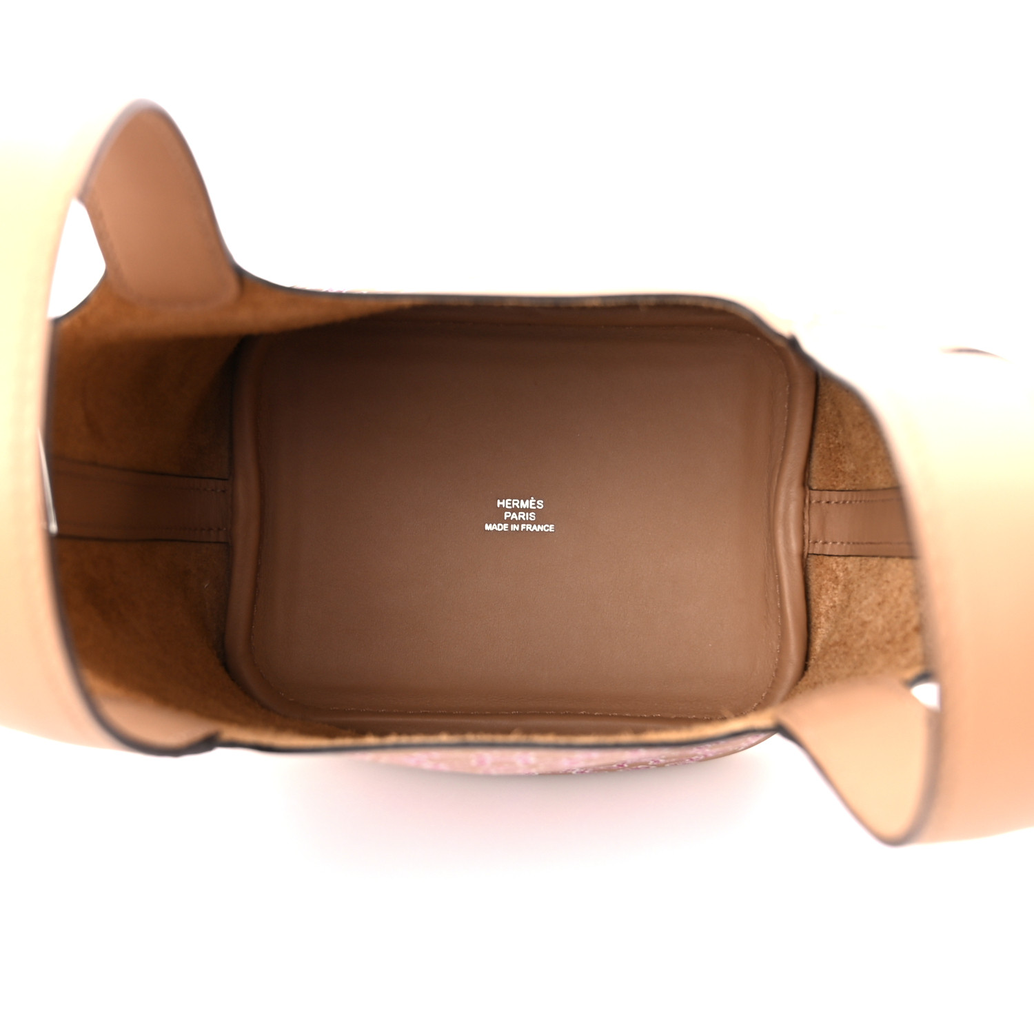 This is an authentic HERMES Swift Micro Lucky Daisy Picotin Lock in Chai, Rose, and White. This chic tote is crafted of swift calfskin leather in brown with silver palladium plated hardware and a pink floral print. This one-piece handbag features strap handles that extend from the sides with an extra layer of leather for support. The handbag opens to a brown suede interior and can be secured with the included padlock.